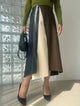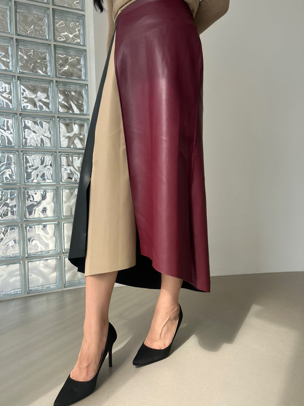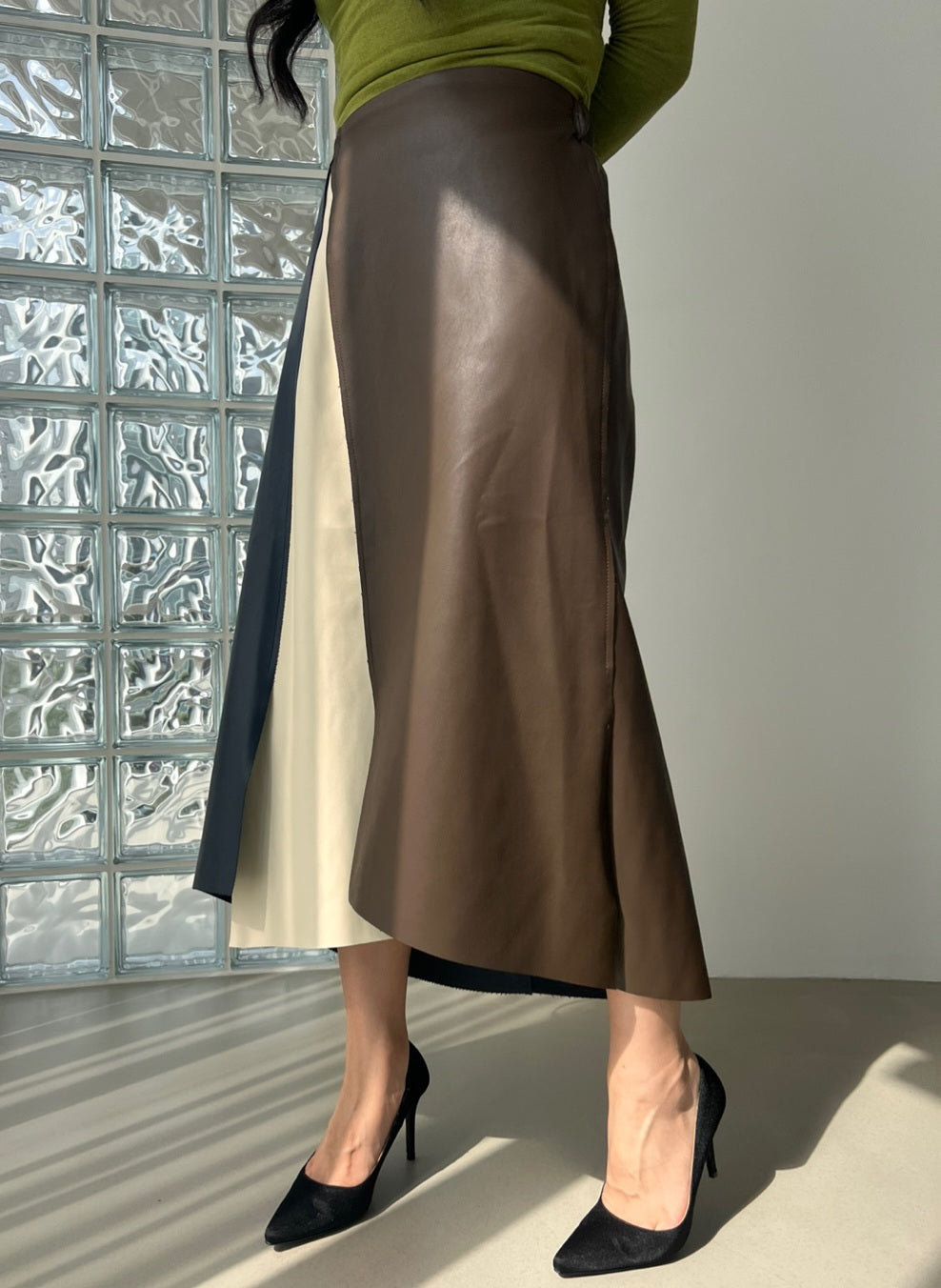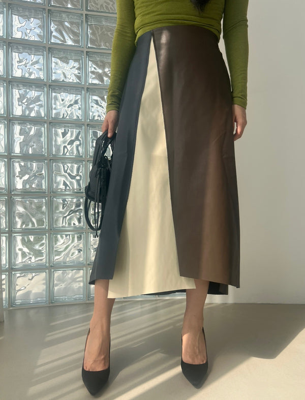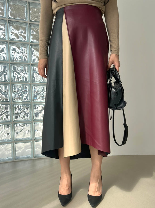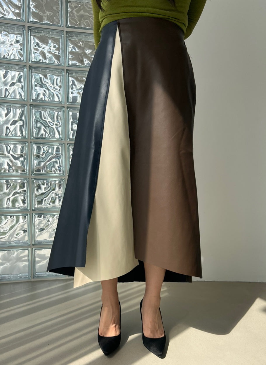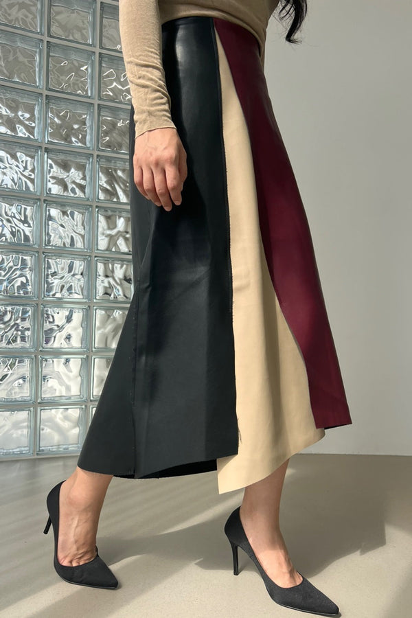 - Color blocked, panel designed unbalanced raw cut leather skirt