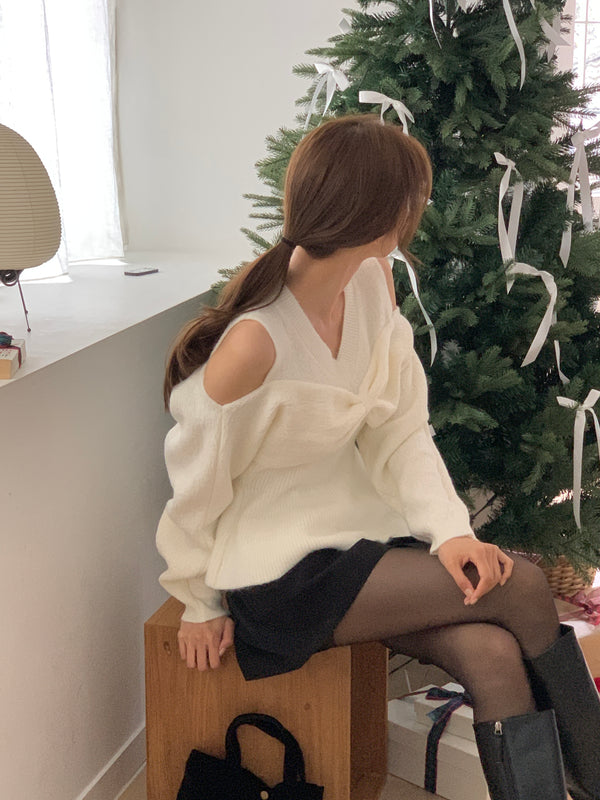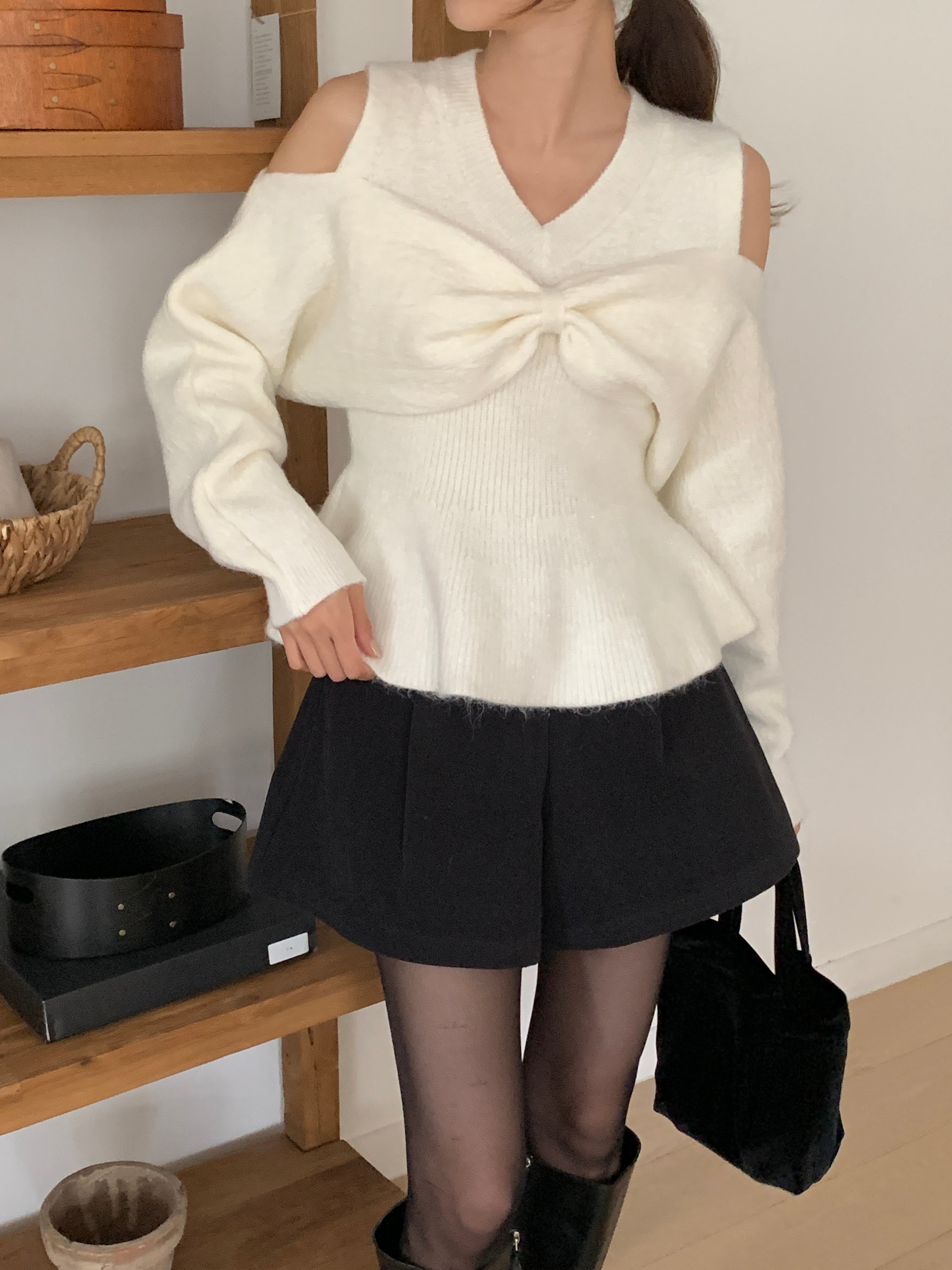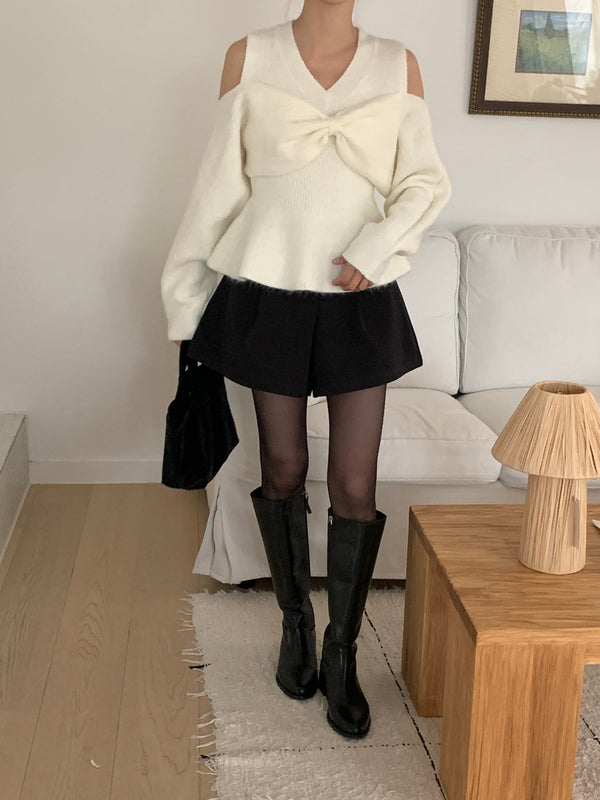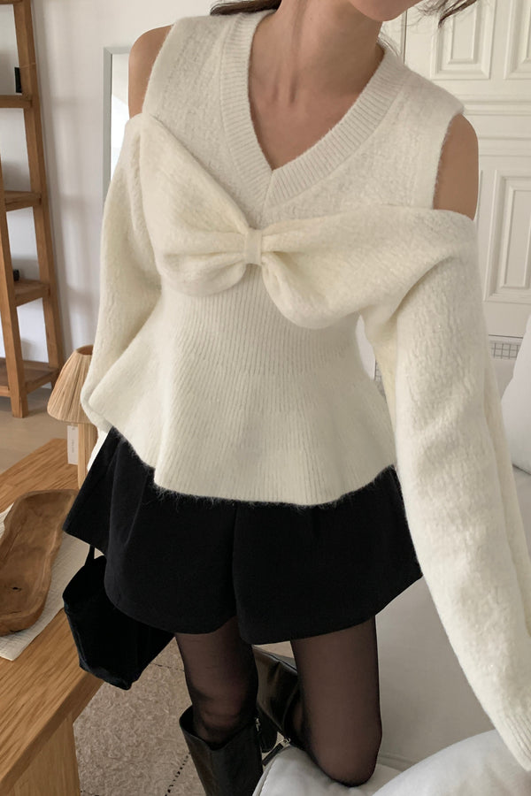 Bow Open Shoulder Peplum Sweater - Grey is backordered and will ship as soon as it is back in stock.