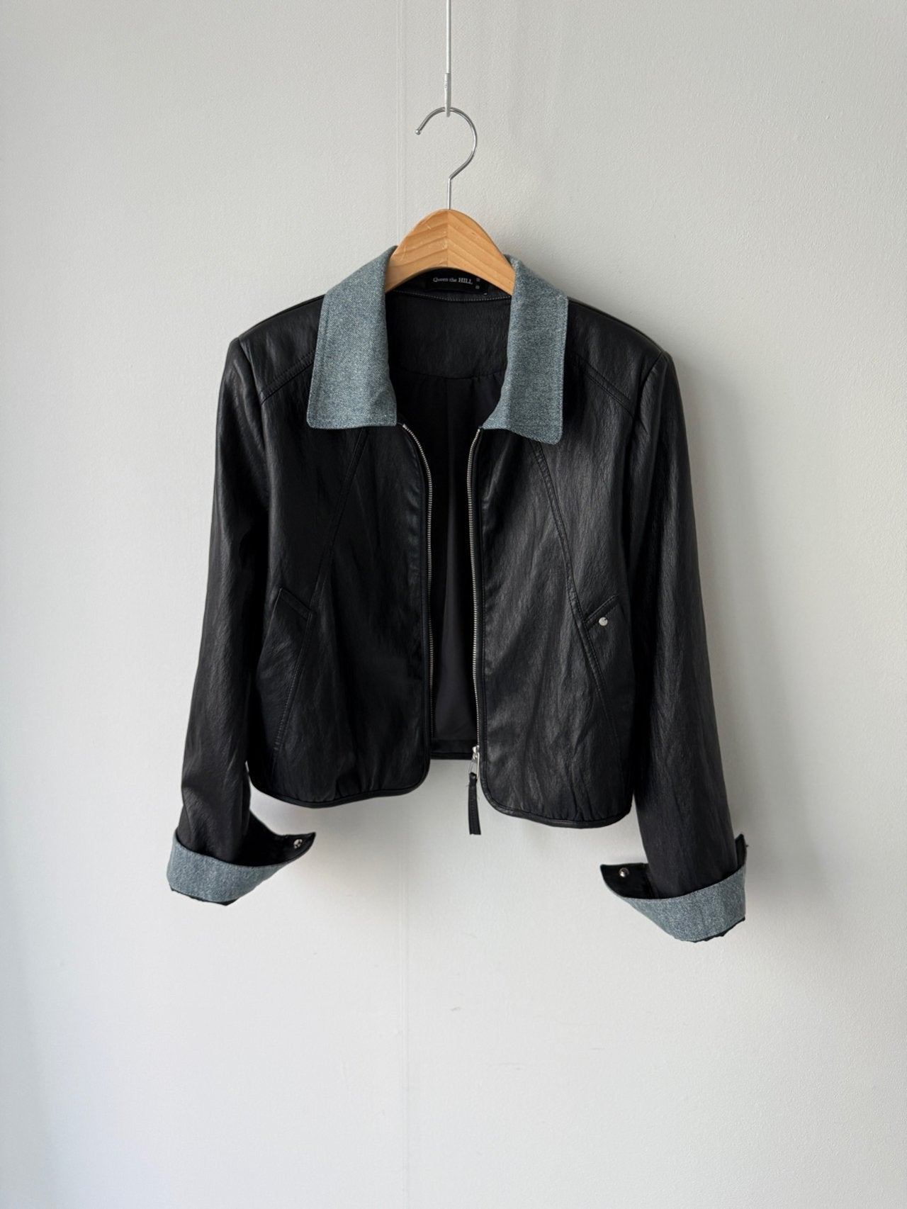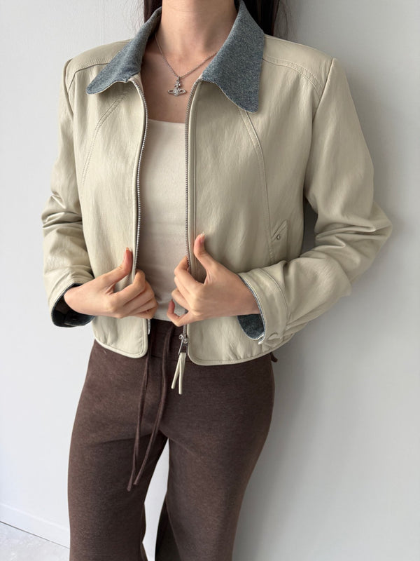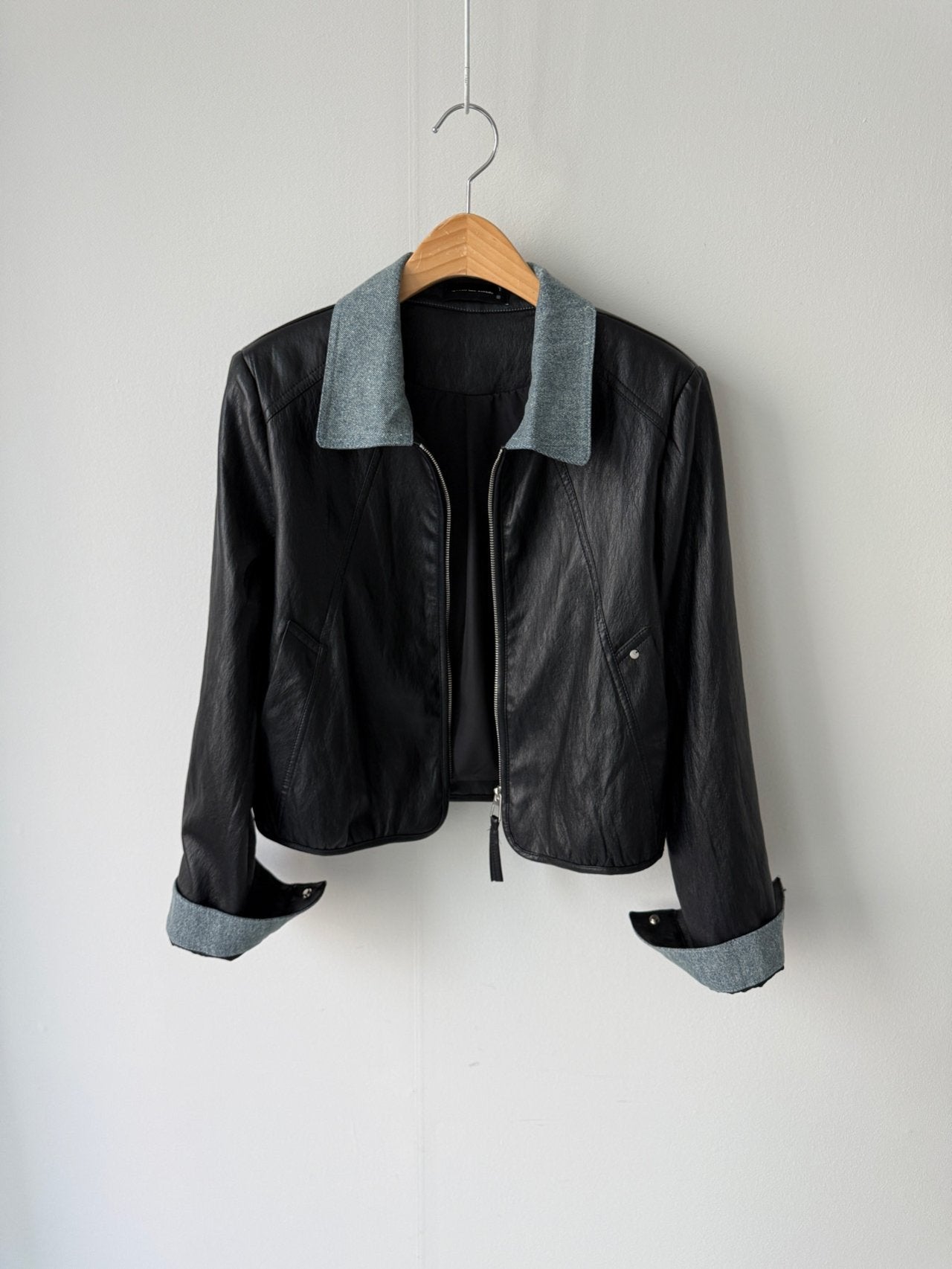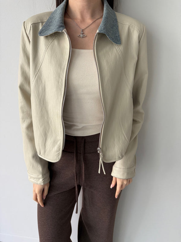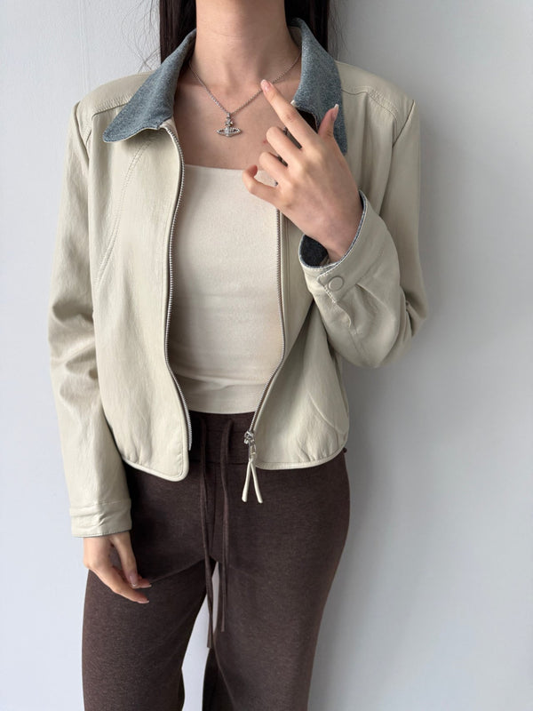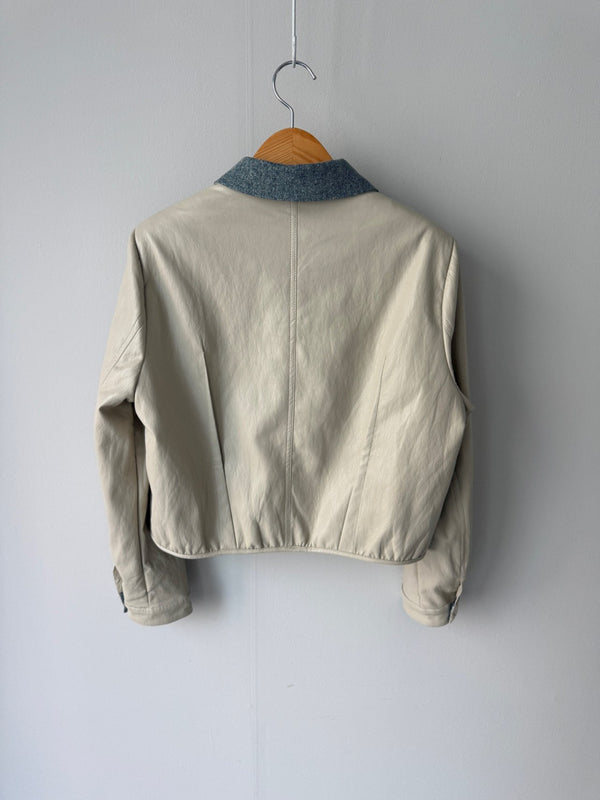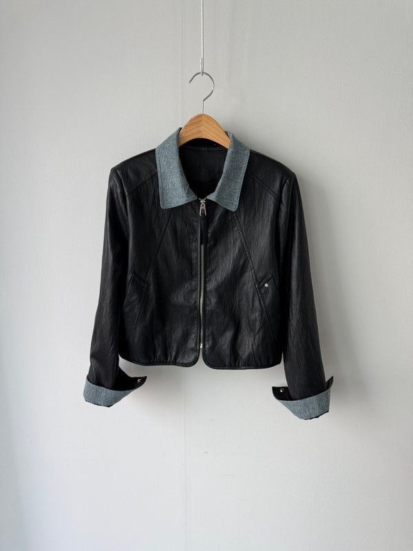 Chambray Collared Cropped Leather Jacket