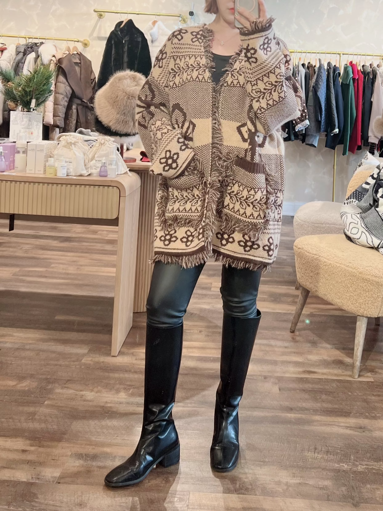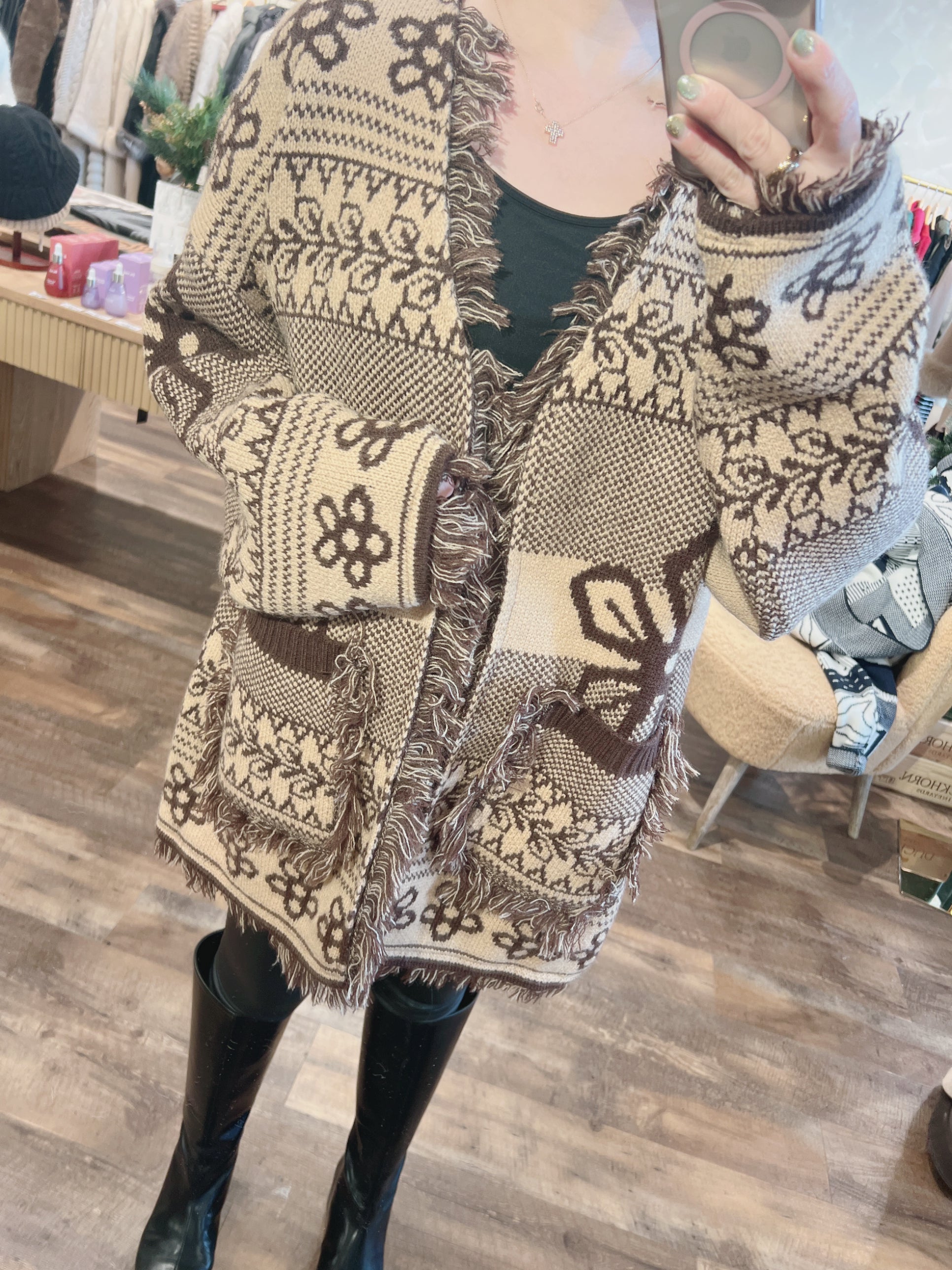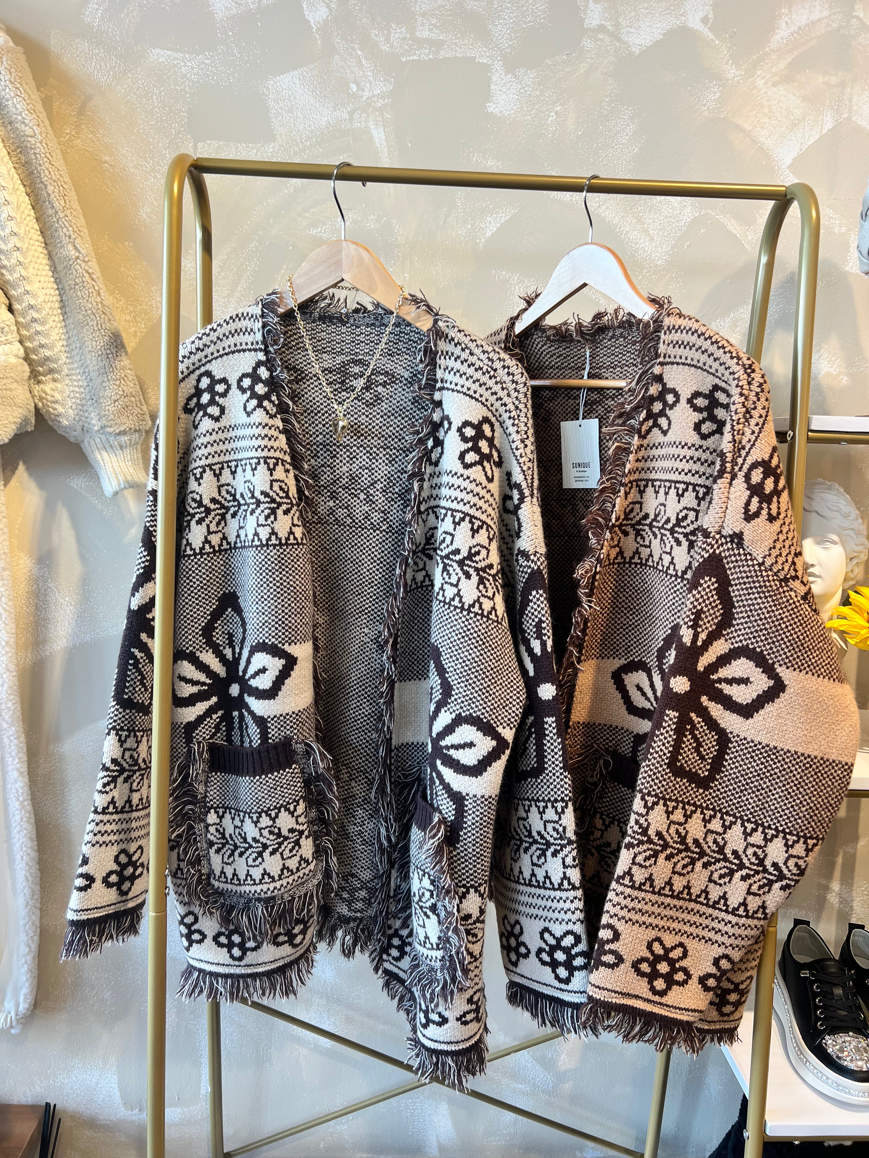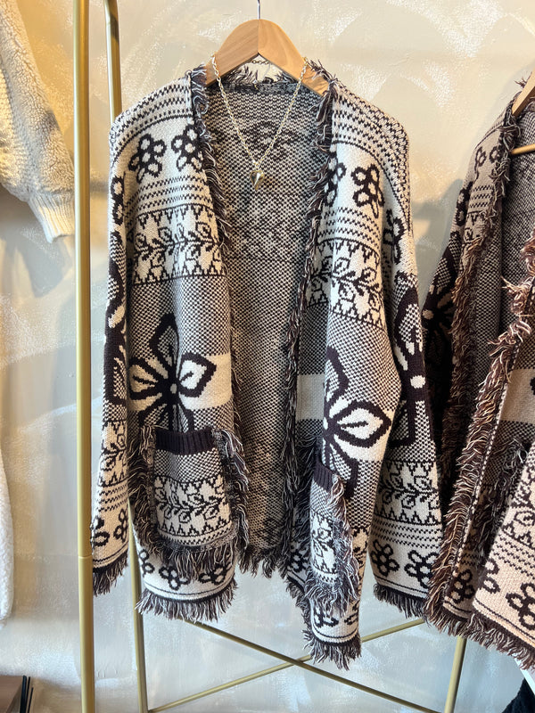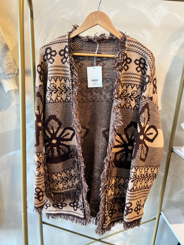 Fringe Pattern Cardigan - Brown is backordered and will ship as soon as it is back in stock.