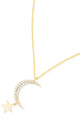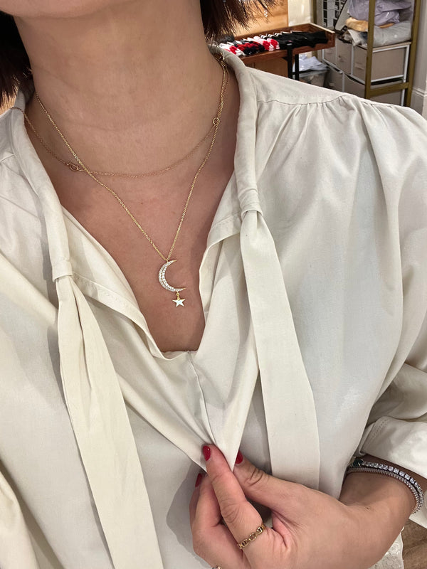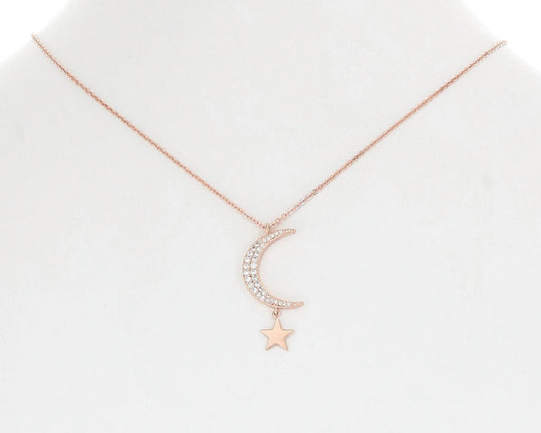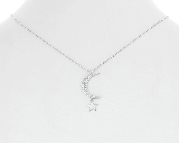 Short Chain Necklace with Simulated White Diamonds Pavè Moon & Dangling Solid Star