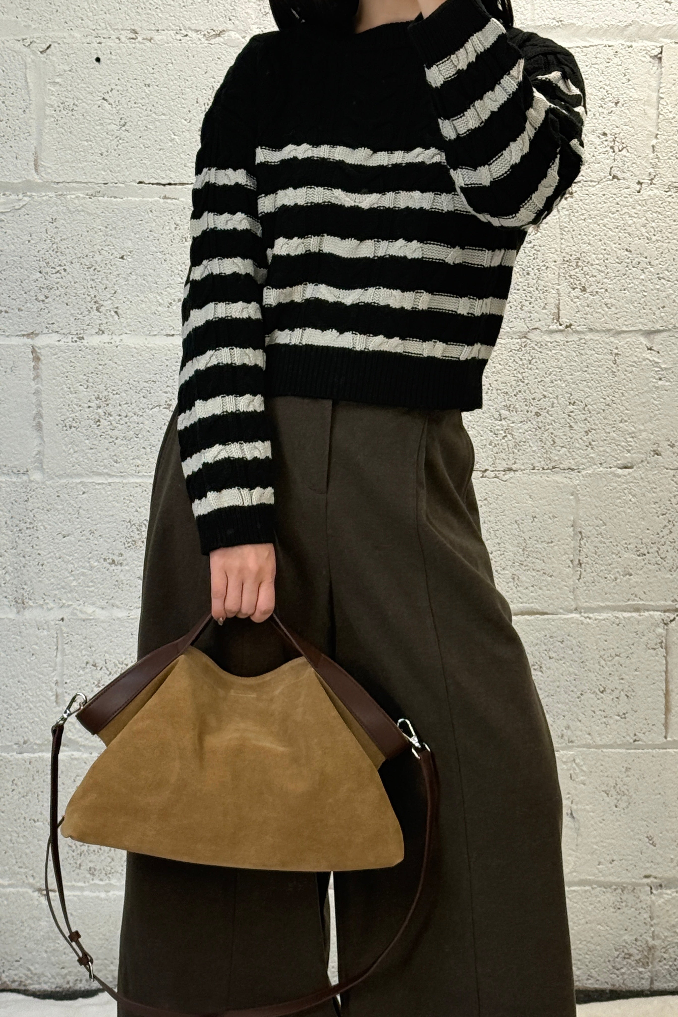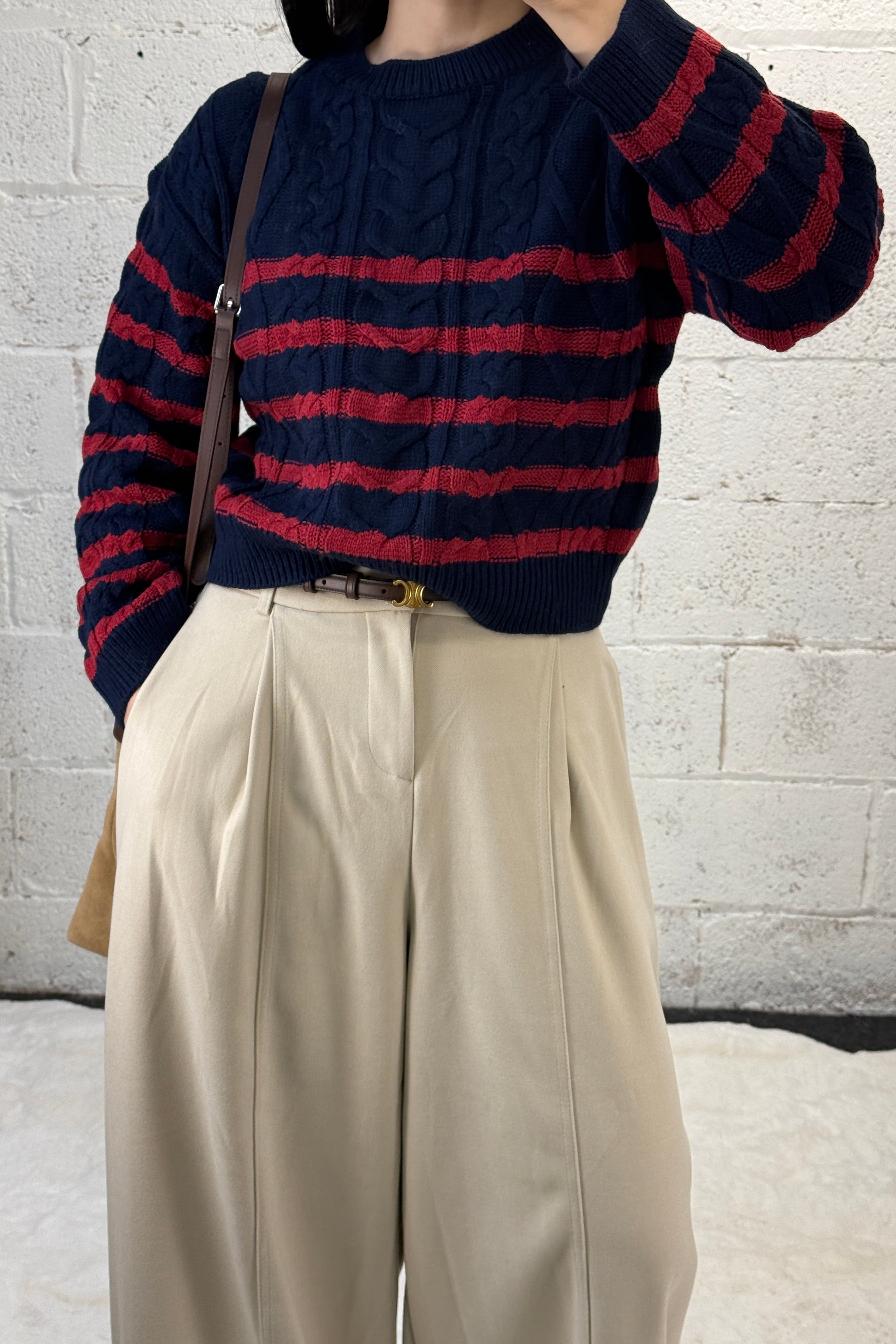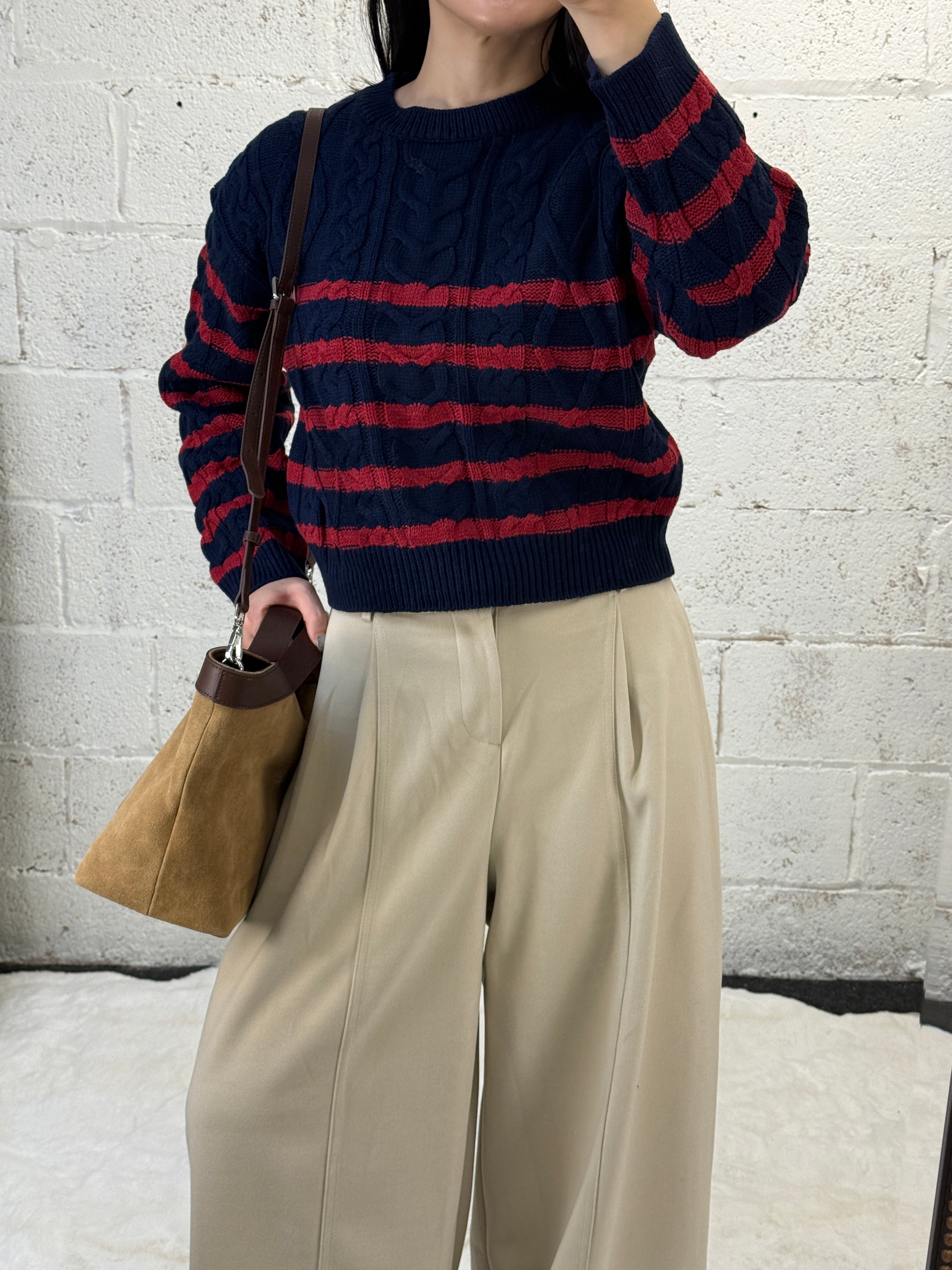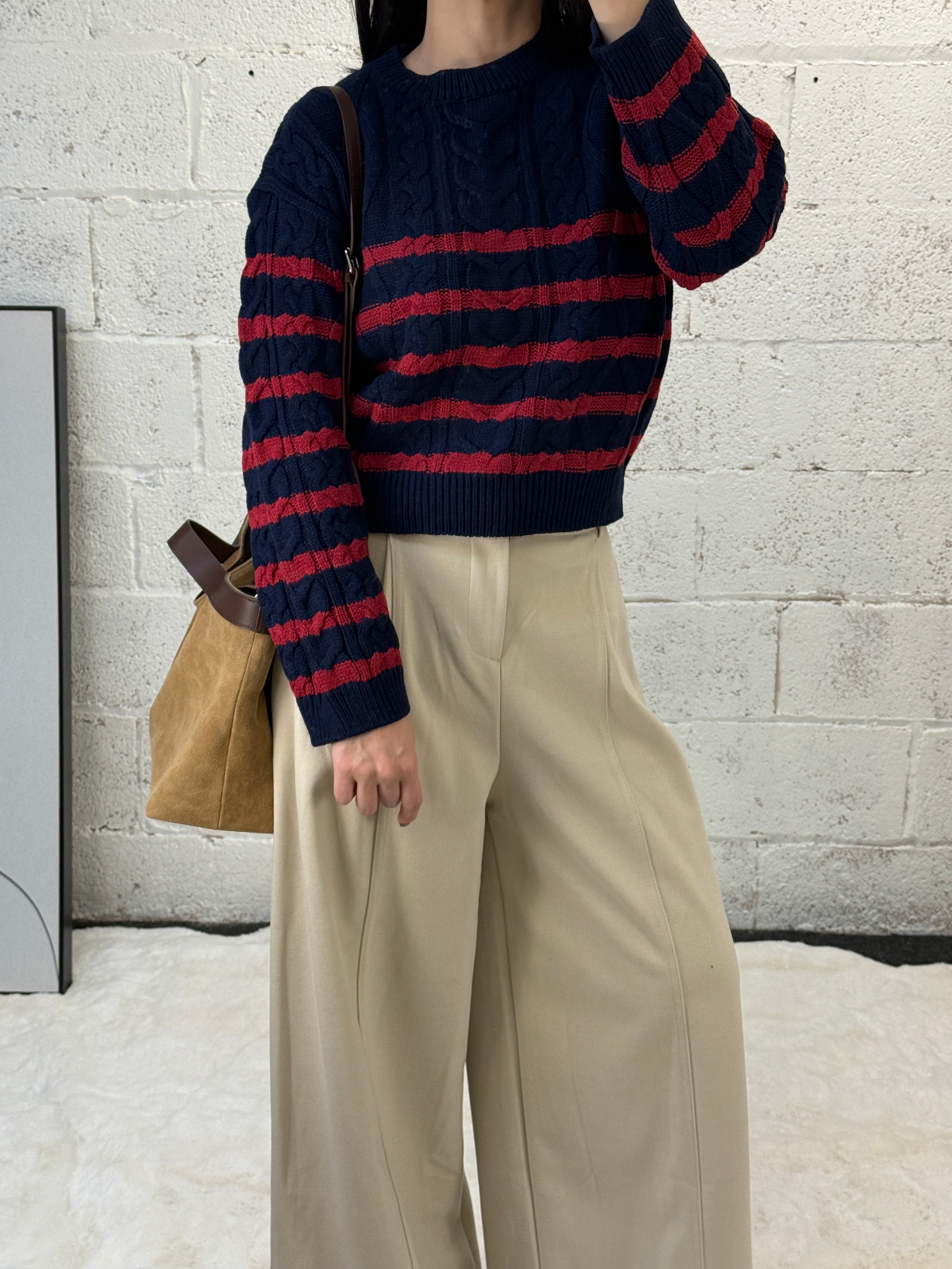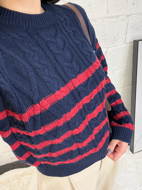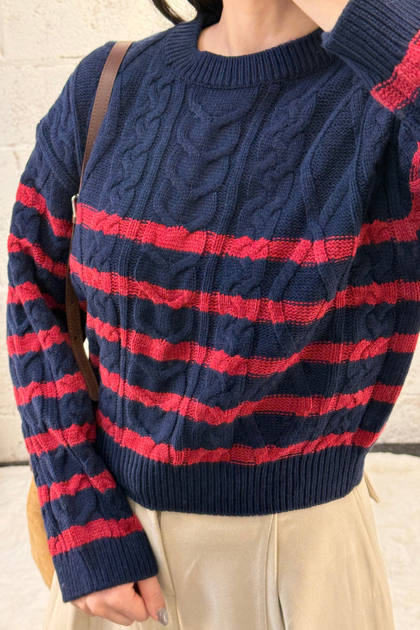 Striped Cable Crop Sweater - Navy/Red is backordered and will ship as soon as it is back in stock.